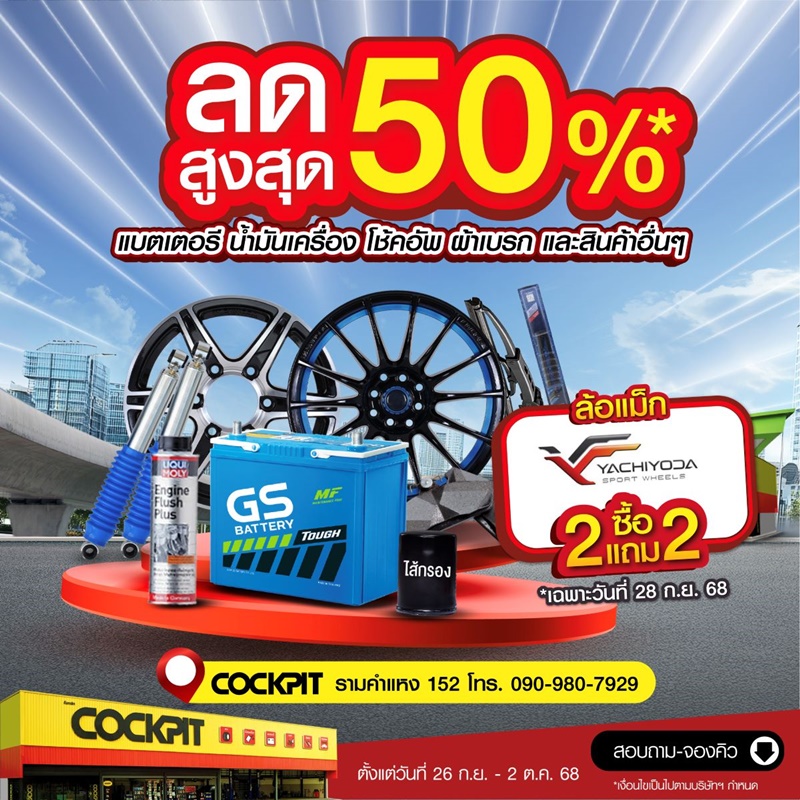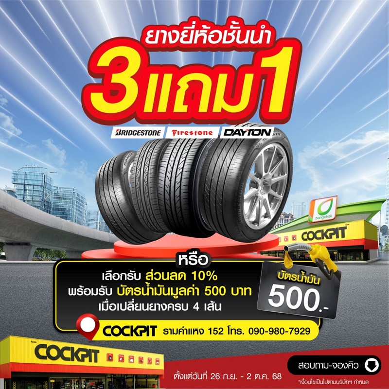 ค็อกพิท (COCKPIT) ศูนย์บริการรถยนต์ครบวงจรฟาสต์ฟิต ภายใต้การบริหารงานของบริษัท บริดจสโตน เอ.ซี.ที (ประเทศไทย) จำกัด รุกขยายสาขาใหม่ในกรุงเทพฯ กับ “ค็อกพิท รามคำแหง 152” ตั้งอยู่ในปั๊มบางจาก ติดปากซอยรามคำแหง 152 บนถนนรามคำแหงขาเข้า ฉลองเปิดสาขาใหม่ด้วยโปรโมชันจัดเต็มพร้อมเสิร์ฟให้คนรักรถเพียบตลอด 7 วัน ตั้งแต่วันที่ 26 กันยายน 2568 – 2 ตุลาคม 2568 ชวนมาเปลี่ยนยางรถยนต์ BRIDGESTONE, FIRESTONE หรือ DAYTON ทุกรุ่น ทุกขนาดที่ร่วมรายการครบ 3 เส้น แถมฟรีอีก 1 เส้น, ยางรถยนต์แบรนด์ชั้นนำลด 10% และผลิตภัณฑ์ดูแลรถยนต์อื่นๆ อีกมากมาย ลดสูงสุดถึง 50% พิเศษ! สำหรับลูกค้าที่ลงทะเบียนในงาน Grand Opening Day วันที่ 28 กันยายน 2568 ยังสามารถลุ้นรับสิทธิ์ซื้อยางรถยนต์ BRIDGESTONE, FIRESTONE หรือ DAYTON 2 เส้น แถมฟรีอีก 2 เส้น จำนวน 30 สิทธิ์เท่านั้น และส่วนลดอื่นๆ อีกมากมาย พบกับกิจกรรมร่วมสนุกลุ้นรับของรางวัลได้ภายในงาน แวะค็อกพิทที่เดียว ครบ จบ คุ้ม เรื่องการดูแลรถยนต์ของคุณ