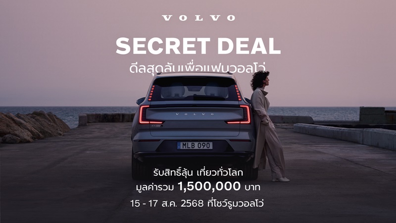 กลับมาอีกครั้งกับกิจกรรม Volvo Secret Deal 2025 ที่ วอลโว่ คาร์ ประเทศไทย จัดขึ้นเพื่อมอบข้อเสนอสุดพิเศษแห่งปี สำหรับผู้สนใจเป็นเจ้าของรถวอลโว่ รับข้อเสนอดีลลับ Secret Deal ที่จะมอบให้เพิ่มเติมสำหรับผู้ที่จองและซื้อรถใหม่ พิเศษสุด สำหรับผู้ที่ซื้อรถภายในงาน ลุ้นรับรางวัลทริปท่องเที่ยวทั่วโลก มูลค่ารวมกว่า 1,500,000 บาท พร้อมรับส่วนลดรถวอลโว่สูงสุด 1,100,000 บาท ระหว่างวันที่ 15 – 17 สิงหาคม พ.ศ. 2568 ณ วอลโว่สตูดิโอ เอ็มสเฟียร์, วอลโว่สตูดิโอ ไอคอนสยาม และโชว์รูมวอลโว่ทั่วประเทศ
