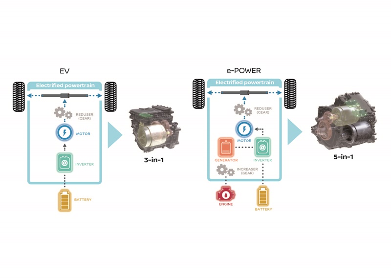 แนวทาง “X-in-1” ซึ่งมีครอบคลุมทั้ง 3 ชิ้นส่วนหลัก หรือ 3-in-1 และแบบ 5 ชิ้นส่วนหลัก หรือ 5-in-1 และรุ่นอื่นๆ ที่เป็นไปได้ จะได้รับการพัฒนาเพื่อให้ส่วนประกอบหลักของระบบขับเคลื่อนทั้งแบบ EV และ แบบe-POWER สามารถดำเนินการผลิตต่อไปได้ในสายการผลิตเดียวกัน