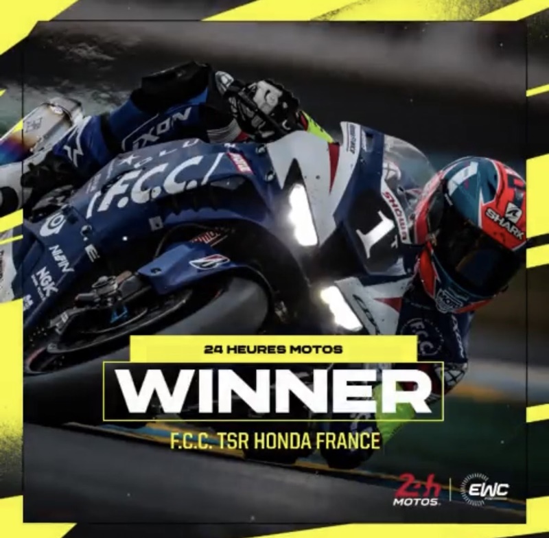 ทีมแข่ง F.C.C. TSR Honda France ผงาดคว้าชัยชนะศึกทรหด 24 ชั่วโมง รายการ เอฟไอเอ็ม เอ็นดูร้านซ์ เวิลด์ แชมเปี้ยนชิพ 2023 (FIM Endurance World Championship – EWC 2023) ในการแข่งขัน 24 Heures Motos ที่เซอร์กิต บูกัตติ เมืองเลอมังส์ ประเทศฝรั่งเศส โดย 3 นักแข่งในทีม ได้แก่ ไมค์ ดิ เมกลิโอ, จอช ฮุค, และ อลัน เทชเชอร์ (Mike di Meglio , Josh Hook, Alan Techer) พร้อมด้วยตัวแข่ง Honda CBR1000RR-R หมายเลข 1
