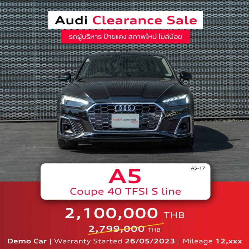 - A5 Coupe 40 TFSI S line จากราคา 2,799,000 บาท เหลือเพียง 2,100,000 บาท