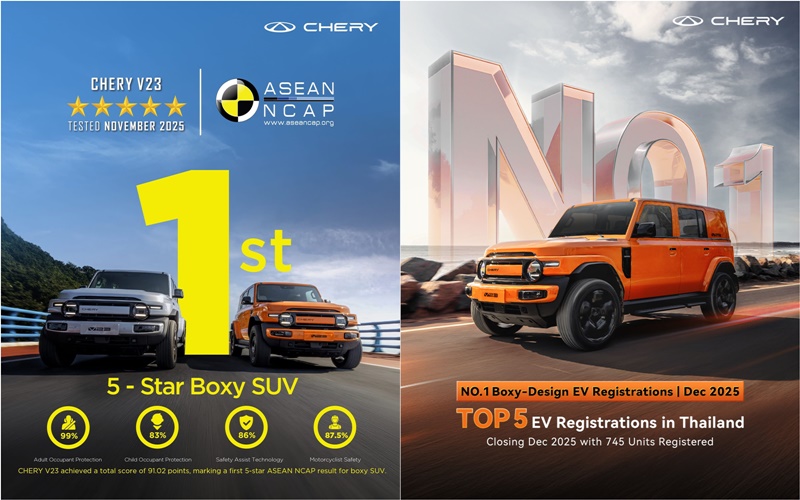 มร. จิม ลี ผู้อำนวยการบริหารแบรนด์ เชอรี ประเทศไทย กล่าวว่า “จากความสำเร็จด้านยอดจองรวมถึงการครองอันดับ 1 ดัชนีประสบการณ์ลูกค้าด้านความพึงพอใจในการซื้อรถยนต์ภายในงานมหกรรมยานยนต์ ครั้งที่ 42 ในเดือนธันวาคม 2568 เชอรี ประเทศไทยสามารถทำยอดจดทะเบียนรถยนต์ไฟฟ้าเชอรีรุ่น V23 ได้สูงถึง 745 คัน ส่งผลให้ แบรนด์ก้าวขึ้นสู่ Top 5 แบรนด์รถยนต์ไฟฟ้าที่มียอดจดทะเบียนสูงสุดในประเทศไทย และยังครองตำแหน่ง อันดับ 1 รถยนต์ไฟฟ้าทรงกล่องที่มียอดจดทะเบียนสูงสุดในประเทศ ตอกย้ำถึงความแข็งแกร่งของแบรนด์เชอรีในตลาดยานยนต์พลังงานไฟฟ้าในประเทศไทยอย่างชัดเจน”