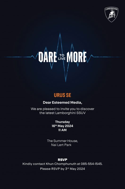 เนื่องด้วย ออโตโมบิลิ ลัมโบร์กินี (Automobili Lamborghini) สุดยอดแบรนด์ซูเปอร์สปอร์ตคาร์หรูระดับโลกสัญชาติอิตาลี นำโดย มร.ฟรานเชสโก้ สกาดาโอนิ ผู้อำนวยการภูมิภาคเอเชียแปซิฟิก ออโตโมบิลิ ลัมโบร์กินี ร่วมกับ อภิชาติ ลีนุตพงษ์ ประธานกรรมการ บริษัท เรนาสโซ มอเตอร์ จำกัด ตัวแทนจำหน่ายรถยนต์ลัมโบร์กินีอย่างเป็นทางการรายเดียวในประเทศไทย ขอเรียนเชิญท่านสื่อมวลชนร่วมงานเปิดตัว URUS SE รถยนต์ซูเปอร์เอสยูวีปลั๊กอินไฮบริด รุ่นแรกของแบรนด์
