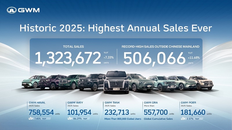 GWM (Thailand) ยกระดับสู่การเป็นแบรนด์รถยนต์ที่มีผลิตภัณฑ์ครอบคลุมทุกประเภทพลังงาน ตอบโจทย์ผู้ใช้งานทุกกลุ่มทั่วโลก ภายใต้แนวคิด “All Scenarios – All Powertrains – All Users” พร้อมก้าวสู่การเป็นแบรนด์รถยนต์จีนที่คนไทยให้ความไว้วางใจสูงสุด และอันดับหนึ่งของแบรนด์รถยนต์จีนด้านบริการหลังการขายผ่านผลิตภัณฑ์ที่มีคุณภาพ เทคโนโลยีที่ล้ำสมัย และการดูแลลูกค้าด้วยความใส่ใจและโปร่งใส โดยในปี 2568 ที่ผ่านมา GWM ประสบความสำเร็จอย่างโดดเด่นด้วย ยอดจำหน่ายรวมทั่วโลก 1,323,672 คัน เติบโต 7.33% เมื่อเทียบกับปีที่ผ่านมา สร้างสถิติสูงสุดใหม่เป็นประวัติการณ์ ขณะที่ยอดจำหน่ายรถยนต์พลังงานใหม่ (NEV) อยู่ที่ 403,653 คัน เพิ่มขึ้น 25.44% ทำสถิติสูงสุดใหม่เช่นกัน และยอดจำหน่ายในตลาดต่างประเทศรวม 506,066 คัน เติบโต 11.68% เมื่อเทียบกับปีก่อน นับเป็นสถิติสูงสุดตลอดกาล สะท้อนถึงการเติบโตอย่างมั่นคงทั้งในเชิงปริมาณและคุณภาพบนเวทีโลก