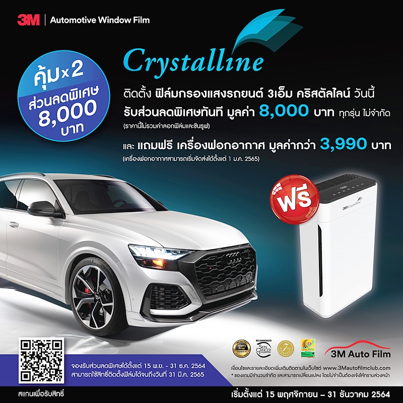 1.แคมเปญคุ้มx2 เพียงติดตั้งฟิล์มกรองแสงรถยนต์ 3เอ็ม คริสตัลไลน์ สำหรับรถยนต์ทุกรุ่น ทุกยี่ห้อ ณ ร้านค้าที่ร่วมรายการ ส่วนลดพิเศษมูลค่า 8,000 บาททันที แถมฟรีเครื่องฟอกอากาศ มูลค่ากว่า 3,990 บาท จองสิทธิ์เพื่อรับส่วนลดพิเศษได้ทาง ตั้งแต่วันนี้ – 31 ธันวาคม 2564 และสามารถใช้สิทธิ์ติดตั้งฟิล์มได้จนถึง 31 มีนาคม 2565
