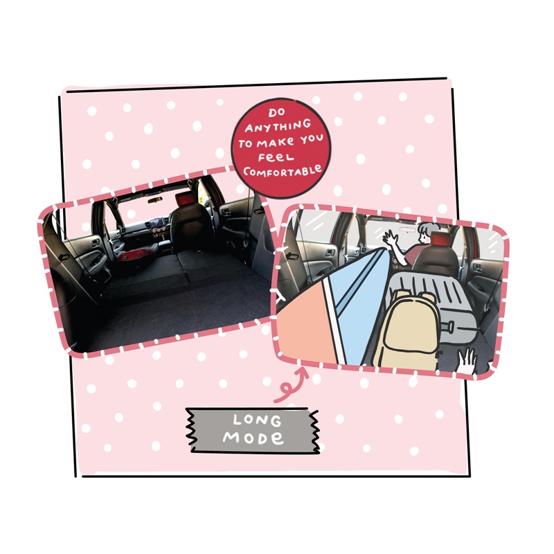 - Long Mode: พับเบาะด้านหน้าและด้านหลัง เพิ่มพื้นที่เก็บของในแนวยาว ตอบโจทย์อย่างยิ่งสำหรับสายเล่นเซิร์ฟ เพราะสามารถใส่เซิร์ฟบอร์ดได้อย่างสบาย ๆ หรือจะใส่อุปกรณ์ตั้งแคมป์แนวยาว ก็เอาอยู่ทุกทริป