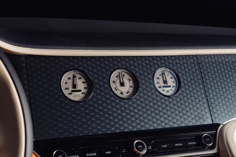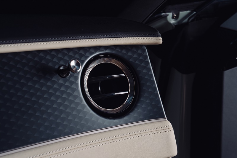 รายละเอียดของ Batur Convertible เผยให้เห็นถึงความหลงใหลในรายละเอียดอันประณีตบรรจงของผู้ครอบครองที่ถ่ายทอดออกมาได้อย่างมีชีวิตชีวาด้วยฝีมืออันละเอียดอ่อนของทีมเบนท์ลีย์ มูลินเนอร์ โดยมีแผงหน้าปัดและราวข้างประตูที่ได้รับการตกแต่งอย่างประณีตด้วยเฉดสีดำด้าน พร้อมแผงคอนโซลกลางที่ตกแต่งด้วยวีเนียร์ในเฉดสีดำ Beluga เคลือบเงา และขอบหน้าปัดด้านนอกที่ทำจากวัสดุไทเทเนียมน้ำหนักเบากับการตกแต่งด้วยเฉดสีดำ Beluga