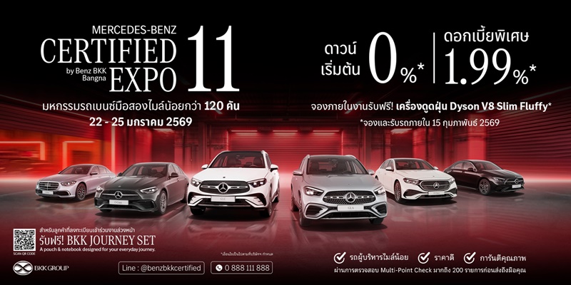 โชว์รูมและศูนย์บริการรถยนต์เมอร์เซเดส-เบนซ์ รวมถึงรถยนต์เมอร์เซเดส-เบนซ์มือสองภายใต้ Mercedes-Benz Certified และศูนย์บริการครบวงจรที่ใหญ่ที่สุด เดินหน้าสร้างปรากฏการณ์ครั้งสำคัญของวงการรถยนต์มือสอง จัดงาน “Mercedes-Benz Certified by Benz BKK Bangna EXPO ครั้งที่ 11” อย่างยิ่งใหญ่ ระหว่างวันที่ 22 – 25 มกราคม 2569 บริเวณชั้น 3 และชั้น 7 โชว์รูม Benz BKK Bangna
