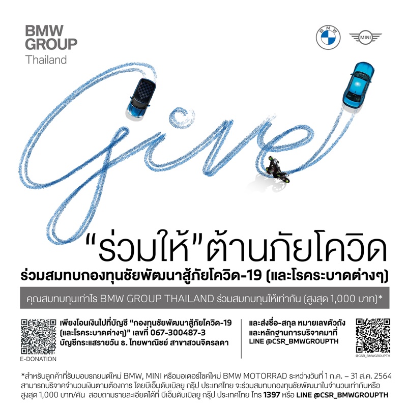 บีเอ็มดับเบิลยู กรุ๊ป ประเทศไทย เดินหน้าส่งต่อความช่วยเหลือในช่วงวิกฤติโควิด-19 อย่างต่อเนื่อง เชิญชวนลูกค้าที่ซื้อรถยนต์บีเอ็มดับเบิลยู มินิ หรือมอเตอร์ไซค์บีเอ็มดับเบิลยู มอเตอร์ราดกับ ผู้จำหน่ายอย่างเป็นทางการทั่วประเทศ และมีกำหนดวันส่งมอบรถระหว่างระหว่างวันที่ 1 กรกฎาคม – 31 สิงหาคม 2564 ร่วมสมทบเงินให้แก่กองทุนชัยพัฒนาสู้ภัยโควิด-19 (และโรคระบาดต่าง ๆ) โดยบีเอ็มดับเบิลยู กรุ๊ป ประเทศไทย จะร่วมสมทบเพิ่มจากเงินบริจาคของลูกค้าแต่ละรายในจำนวนเท่ากัน หรือมูลค่าสูงสุด 1,000 บาทต่อคัน ซึ่งจะนำไปสนับสนุนการจัดสร้างห้องระบบแลกเปลี่ยนอากาศแรงดันลบแบบสมบูรณ์ (True Negative Pressure) เสริมการป้องกันการแพร่ระบาดของเชื้อไวรัสโควิด-19 ให้แก่บุคลากรทางการแพทย์และผู้ป่วย