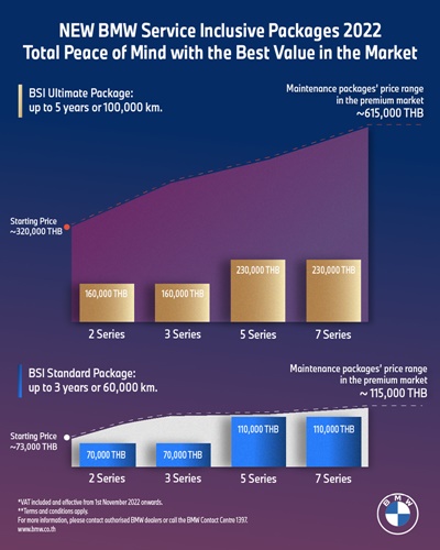 บีเอ็มดับเบิลยู ประเทศไทย มุ่งมั่นมอบความอุ่นใจและความคุ้มค่าสูงสุดให้กับลูกค้า พร้อมบริการระดับพรีเมียมจากโปรแกรมบำรุงรักษา BMW Service Inclusive (BSI) ที่คัดสรรมาโดยเฉพาะ ให้ลูกค้าได้สัมผัสกับคุณภาพด้านการให้บริการที่เหนือระดับเช่นเดิม จากมืออาชีพที่มีความชำนาญและให้บริการด้วยอะไหล่แท้จากบีเอ็มดับเบิลยูเท่านั้น วางใจได้ในทุกเส้นทางการขับขี่โดยไม่ต้องกังวลถึงค่าใช้จ่ายในการดูแลบำรุงรักษา อย่างไรก็ตาม ด้วยปัจจัยภายนอกที่เกี่ยวเนื่องกับภาวะเศรษฐกิจโลก เช่น อัตราเงินเฟ้อและอัตราดอกเบี้ยที่เพิ่มสูงขึ้นทั่วโลก ส่งผลให้จำเป็นต้องมีการปรับราคาบางรายการของโปรแกรมบำรุงรักษา โดยจะยังคงราคาเดิมไปจนถึงวันที่ 30 ตุลาคม พ.ศ. 2565 นี้
