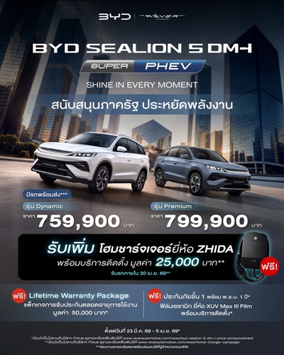 - BYD SEALION 5 DM-i นิยามใหม่ของ SUV ที่คุ้มค่าเกินราคา ขับเคลื่อนด้วยขุมพลังDM-i SUPER PHEV วิ่งไกลสูงสุดถึง 1,200 กม. ต่อการชาร์จและน้ำมันเต็มถัง* เป็นเจ้าของได้ในราคาเริ่มต้น 759,900 บาท