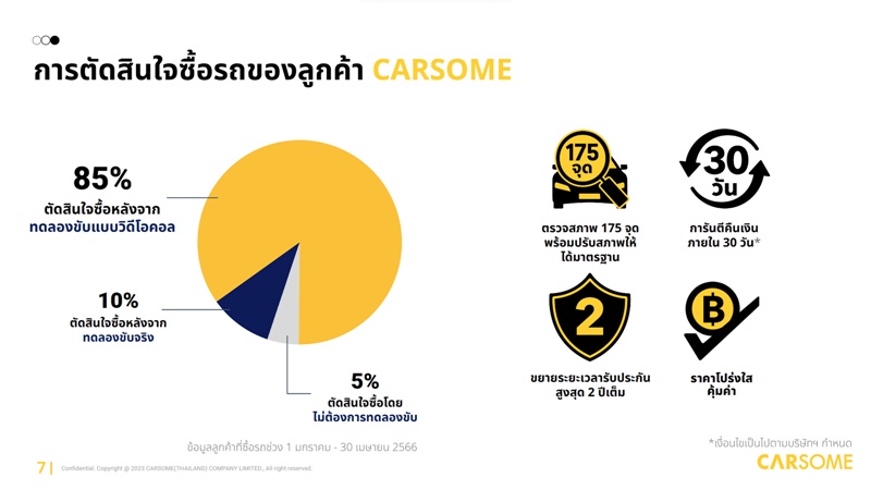 CARSOME ได้เปิดเผยถึงภารกิจที่มุ่งมั่นในการส่งต่อความน่าเชื่อถือ ความโปร่งใส และทางเลือกที่หลากหลายให้กับลูกค้า ด้วยการเสนอตัวเลือกการทดลองขับรถยนต์มือสองที่ตอบโจทย์ลูกค้าทั้งแบบออนไลน์และออฟไลน์ จากข้อมูลของ CARSOME ประเทศไทยช่วงเดือนมกราคม-เมษายน 2566 คนที่สนใจรถมือสองของ CARSOME เลือกการทดลองขับผ่านวิดีโอคอลถึง 89% ซึ่งมากกว่ากลุ่มที่เลือกทดลองขับจริงอย่างมีนัยยะสำคัญ ยิ่งกว่านั้น ลูกค้าที่ซื้อรถยนต์กับ CARSOME กว่า 85% ตัดสินใจซื้อหลังจากการทดลองขับผ่านวีดีโอคอลเท่านั้น ในขณะที่ 10% ซื้อหลังจากทดลองขับจริง และลูกค้าอีก 5% ไม่ได้ผ่านการทดลองขับใด ๆ ทั้งสิ้น