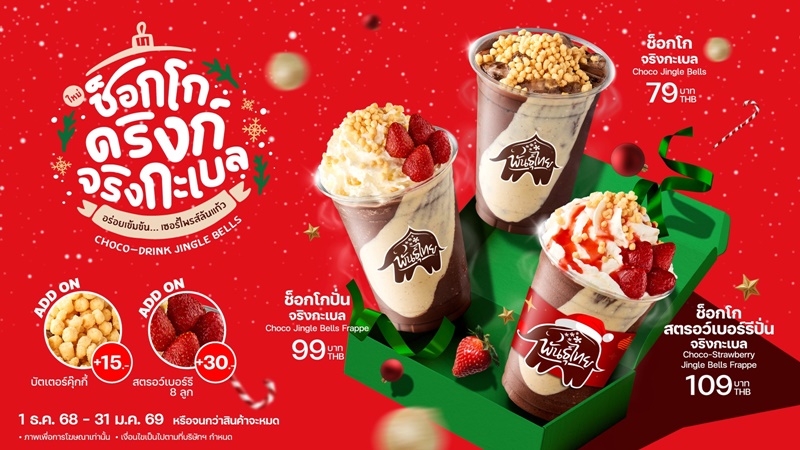 ความสดใสของเทศกาลที่แท้ทรูกับช็อกโกแลตหน้าล้น ดับเบิ้ลท็อปปิ้งได้ตามใจ พิเศษ! เพิ่มบัตเตอร์คุ๊กกี้ เพียง 15.- หรือ สตรอว์เบอร์รี 7-8 ลูก (ตามน้ำหนัก) เพียง 30.- อร่อยฟินถ่ายรูปสวยกับช็อกโกเข้ม จัดเต็มความเซอร์ไพรส์แบบจริงกะเบล! ตั้งแต่วันที่ 1 ธันวาคม 2568 – 31 มกราคม 2569 หรือจนกว่าสินค้าจะหมด ที่ร้านพันธุ์ไทยทุกสาขาทั่วประเทศ และบริการเดลิเวอรี ส่งตรงความสุขถึงบ้าน