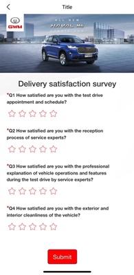 เกรท วอลล์ มอเตอร์ ยึดมั่นในกลยุทธ์การดำเนินธุรกิจที่ยึดถือลูกค้าเป็นหัวใจสำคัญ (Customer-Centric) ฟีเจอร์ Test drive and delivery satisfaction survey ช่วยให้ลูกค้าหรือผู้ที่สนใจสามารถส่งความเห็นและประเมินความพึงพอใจในการใช้บริการได้ทันที หลังจากที่ได้ทดลองขับรถยนต์หรือส่งมอบรถยนต์เสร็จสิ้นแล้ว โดยจะมีการส่งแบบประเมินให้กับลูกค้าใน GWM Application โดยอัตโนมัติ ช่วยให้ทำการประเมินได้อย่างรวดเร็วและสะดวกสบายยิ่งขึ้น ซึ่งทุกๆ ความเห็นและผลการประเมินจะถูกนำไปใช้ในการพัฒนาและปรับปรุงการทำงานเพื่อให้สามารถส่งมอบผลิตภัณฑ์และบริการที่เปี่ยมไปด้วยประสบการณ์อันน่าประทับใจที่สุดกับลูกค้า