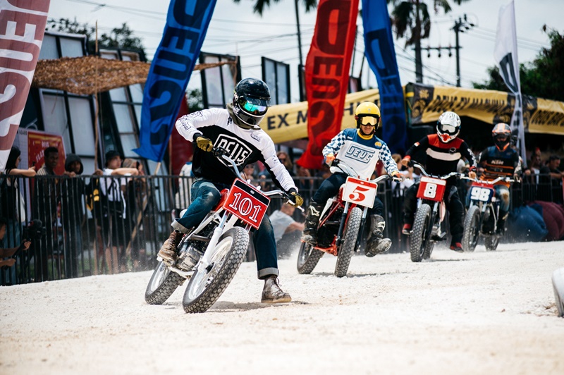 ปิดท้าย Deus Slidetober Fest 2019 ด้วยการแข่งขันอันน่าตื่นเต้นที่ทุกคนต่างตั้งตารออย่าง Flat Track โดย Deus Ex Machina ได้สร้างสนาม Flat Track ขึ้นมาบนลานจอดรถตรงข้าม Deus Temple และได้เตรียมรถมอเตอร์ไซค์คัสตอมของ Deus Temple รุ่น KLX 150’s สำหรับการแข่งขันรอบนี้อีกด้วย รถมอเตอร์ไซค์คัสตอมถูกปล่อยลงสนามครั้งละ 4 คัน และผู้เข้าร่วมการแข่งแข่งมีโอกาสขี่เพียงแค่ 4 รอบสนามเท่านั้น โดยผู้ชนะ 2 คนแรกจะได้เข้า