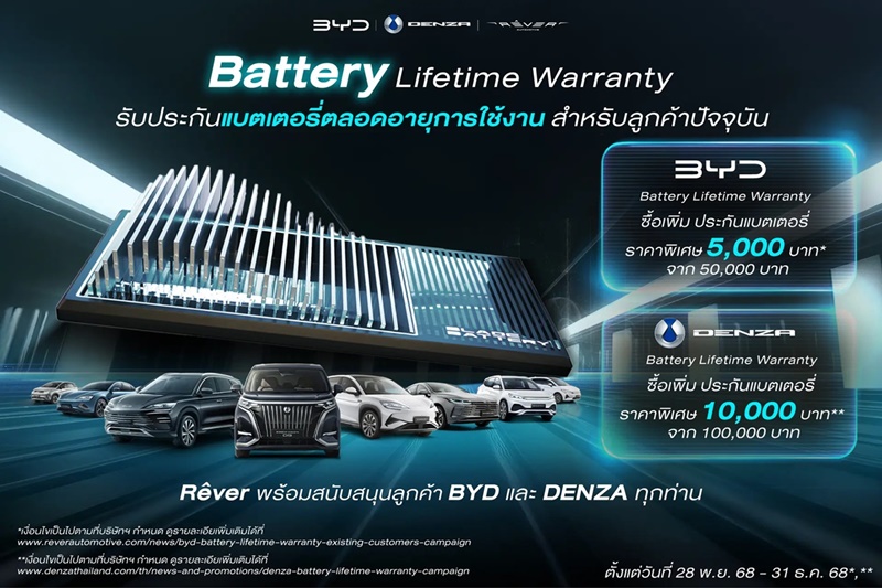 - มั่นใจกับ แพ็คเกจการรับประกันแบตเตอรี่ รวมถึงมอเตอร์ขับเคลื่อนและ ชุดควบคุมมอเตอร์ขับเคลื่อน ตลอดอายุการใช้งาน ในราคาพิเศษเพียง 5,000 บาท สำหรับ บีวายดี และ 10,000 บาท สำหรับ เดนซ่า หมดเขต 31 ธันวาคม 2568 นี้เช่นกัน