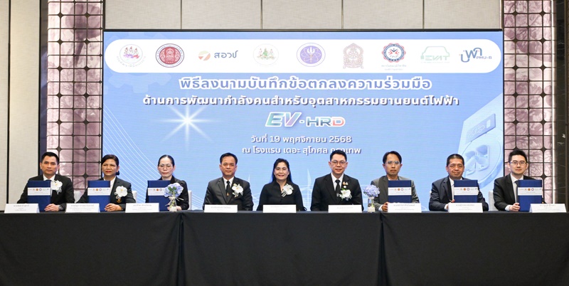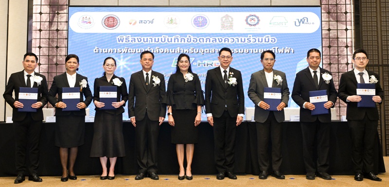 นายสุโรจน์ เเสงสนิท นายกสมาคมยานยนต์ไฟฟ้าไทย พร้อมด้วย ผู้บริหารระดับสูงจาก 5 หน่วยงานพันธมิตร อันได้แก่ นายสมชาติ สุภารี รองอธิบดีกรมพัฒนาฝีมือแรงงาน, นางบัญชาลักษณ์ ลือสวัสดิ์ ที่ปรึกษาด้านมาตรฐานอาชีวศึกษาธุรกิจและบริการ สำนักงานคณะกรรมการการอาชีวศึกษา, ดร.สิริพร พิทยโสภณ รองผู้อำนวยการสำนักงานสภานโยบายการอุดมศึกษา วิทยาศาสตร์ วิจัยและนวัตกรรมแห่งชาติ (สอวช.), นายนิธิวัชร์ ศิริปริยพงศ์ รองผู้อำนวยการสถาบันคุณวุฒิวิชาชีพ (องค์กรมหาชน) และดร.รัฐภูมิ ตู้จินดา รองผู้อำนวยการ หน่วยบริหารและจัดการทุนด้านการพัฒนากำลังคนและทุนด้านการพัฒนาสถาบันอุดมศึกษา การวิจัยและการสร้างนวัตกรรม ร่วมลงนามบันทึกข้อตกลงความร่วมมือด้านการพัฒนากำลังคนสำหรับอุตสาหกรรมยานยนต์ไฟฟ้า (EV-HRD) และการประชุมประชาพิจารณ์เพื่อรับฟังความคิดเห็น “โครงการศึกษาเพื่อจัดทำข้อเสนอแนะเชิงนโยบายการพัฒนากำลังคน สำหรับอุตสาหกรรมยานยนต์สมัยใหม่ (EV-HRD)” ณ ห้องกมลทิพย์บอลรูม โรงแรม เดอะ สุโกศล กรุงเทพมหานคร