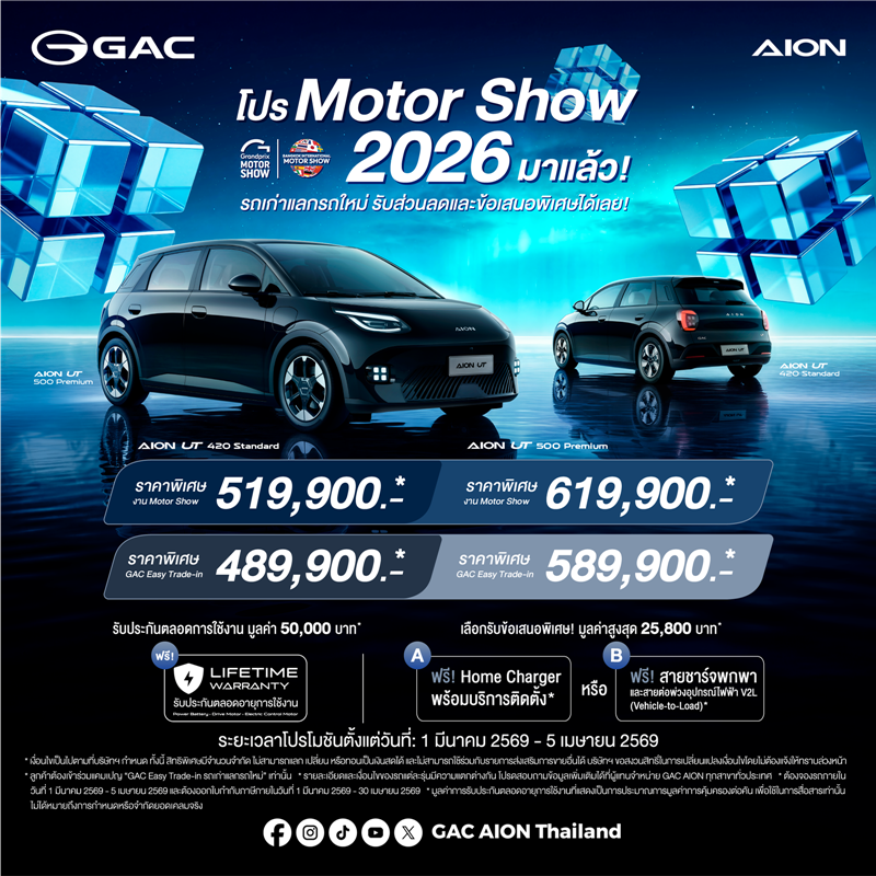 สำหรับลูกค้าที่สนใจสัมผัสประสบการณ์แห่งอนาคตและนวัตกรรมยานยนต์ไฟฟ้าระดับโลกจาก GAC สามารถเข้ามาชมรถคันจริงและร่วมทดลองขับรถยนต์พลังงานใหม่ทุกรุ่นจาก GAC ได้ที่บูธ GAC AION Thailand (บูธ A20) ณ อาคารชาเลนเจอร์ฮอลล์ 1 อิมแพ็ค เมืองทองธานี ตั้งแต่วันที่ 25 มีนาคม – 5 เมษายน 2569 หรือเข้าร่วมแคมเปญ Trade-in และสัมผัสตัวจริงได้ที่โชว์รูม GAC AION ทั่วประเทศ