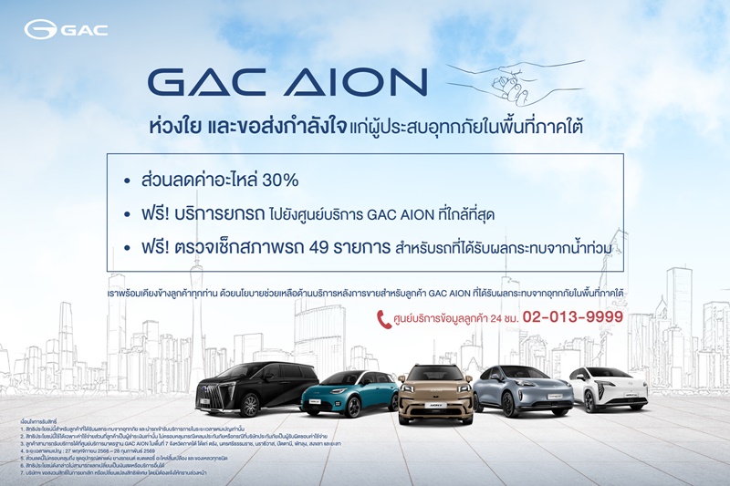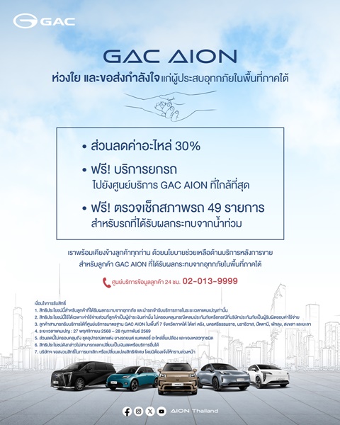 GAC AION Thailand พร้อมอยู่เคียงข้างลูกค้าในทุกสถานการณ์และขอเป็นกำลังใจให้พี่น้องชาวใต้ผ่านพ้นวิกฤตครั้งนี้ไปได้โดยเร็ว ลูกค้าที่ได้รับผลกระทบสามารถนัดหมายเข้ารับบริการได้ที่ศูนย์บริการ GAC AION ในพื้นที่ 7 จังหวัดภาคใต้ หรือสอบถามข้อมูลเพิ่มเติมได้ที่ GAC AION Call Center โทร 02-013-9999. และติดตามข่าวสารได้ทาง Facebook: GAC AION Thailand