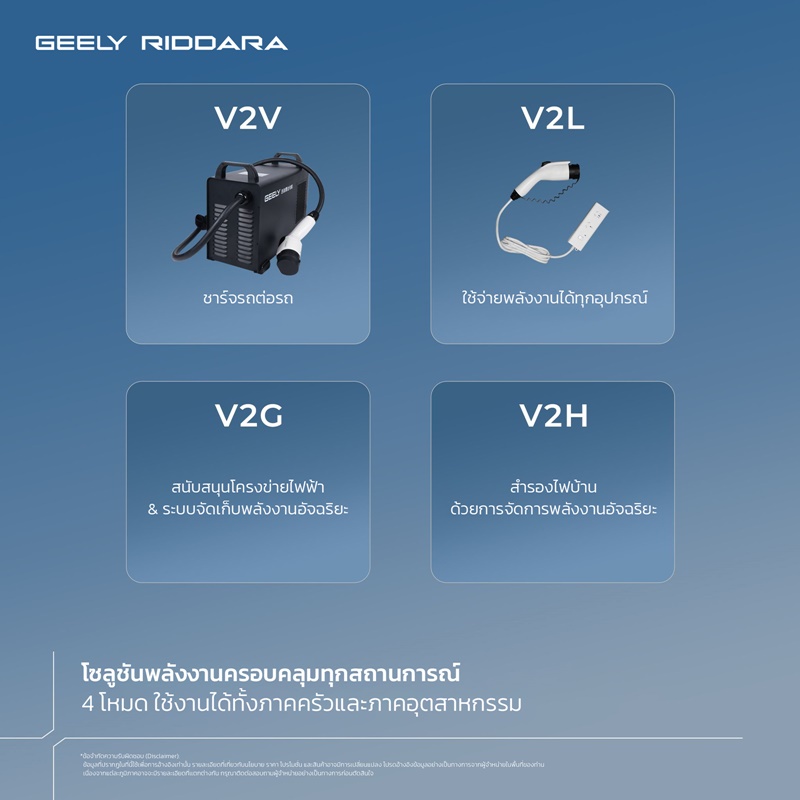 รองรับกำลังจ่ายสูงสุดถึง 21 kW ได้ทุกที่ ทุกเวลา โดยมีหัวจ่ายให้ 2 แบบ: แบบสองขา และสามขา ใช้วัสดุนีลอนที่มีคุณสมบัติทนไฟสูง พร้อมสายมาตรฐานระดับสากล พร้อมโครงสร้างวัสดุที่แข็งแรง ปลอดภัย อีกทั้งยังมีตัวแปลงไฟ AC V2L ของ GEELY RIDDARA ช่วยให้สามารถจ่ายไฟกำลังสูงได้อย่างเสถียร และรองรับอุปกรณ์ได้หลากหลาย ใช้งานได้ทั้งงานกลางแจ้งและสถานการณ์ฉุกเฉิน