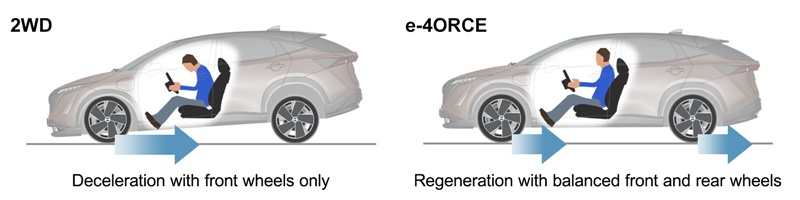 เมื่อจับคู่กับเทคโนโลยีขับเคลื่อนรถยนเตอร์ไฟฟ้า (EV) หรือ อี-พาวเวอร์ (e-POWER) ประสิทธิภาพของระบบจะยิ่งโดดเด่นขึ้นไปอีก ขณะที่ อี-ฟอร์ซ ทำหน้าที่ควบคุมการกระจายกำลังไปยังแต่ละล้ออย่างแม่นยำ การทำงานร่วมกันของทั้งสองเทคโนโลยีนี้ช่วยให้การเร่งความเร็วราบรื่นขึ้น การตอบสนองคมชัดขึ้น ทรงตัวดี และมอบความมั่นใจในทุกจังหวะของการขับขี่อย่างชัดเจน