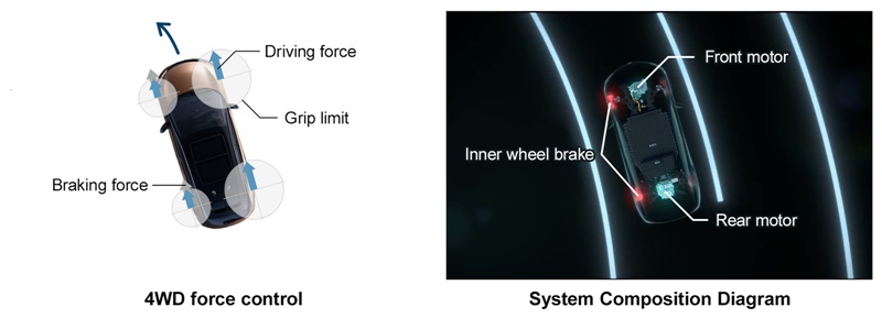 อี-ฟอร์ซ รับมือกับความท้าทายนี้ได้อย่างมีประสิทธิภาพ ด้วย มอเตอร์ไฟฟ้าคู่ หน้า–หลัง ที่ทรงพลัง ซึ่งทำงานอย่างอิสระเพื่อคำนวณแรงขับเคลื่อนที่เหมาะสมกับการเลี้ยว การเร่ง และการเบรกตามการควบคุมของผู้ขับ พร้อมระบบควบคุมเบรกซ้าย-ขวาอย่างแม่นยำ เพื่อให้แรงขับเคลื่อนทั้ง สี่ล้อทำงานได้เต็มประสิทธิภาพ แตกต่างจากระบบขับเคลื่อนสี่ล้อแบบทั่วไปที่จำกัดการกระจายแรงไว้ที่ 50:50 โดย อี-ฟอร์ซ สามารถปรับแรงขับเคลื่อนระหว่างล้อหน้า และหลังได้อย่างอิสระ ตั้งแต่ 100:0 ถึง 0:100 และเมื่อผสานกับระบบควบคุมเบรก ล้อซ้ายและขวาก็สามารถปรับแรงได้ด้วยความเร็วและความแม่นยำสูง มอบการควบคุมที่เหนือระดับในทุกเส้นทาง