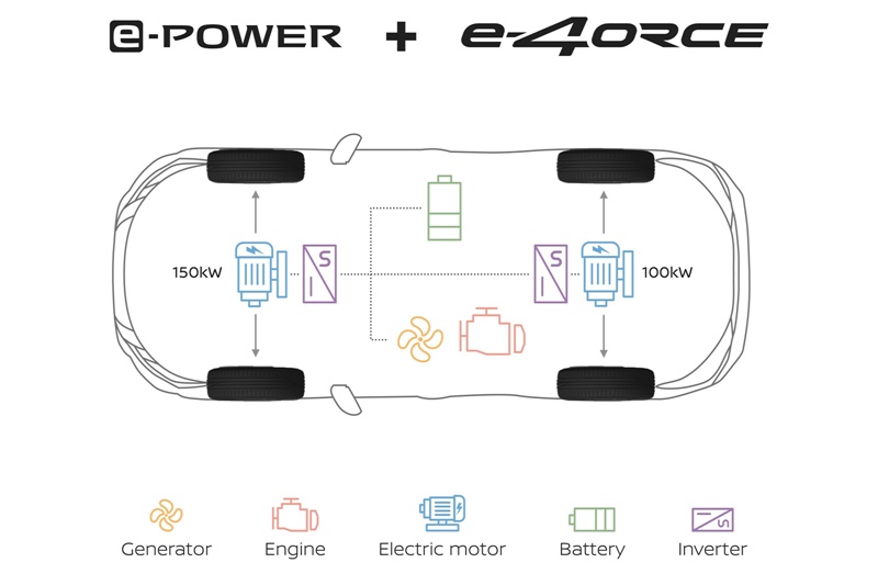 ในการพัฒนา อี-ฟอร์ซ นิสสัน ได้รวมเอา 3 เทคโนโลยีขั้นสูงที่เกี่ยวข้องกับการขับเคลื่อน การทรงตัวมารวมไว้ด้วยกัน คือ “อี-พาวเวอร์” ระบบขับเคลื่อนด้วยมอเตอร์ไฟฟ้า ที่ให้ความเงียบ แต่เต็มไปด้วยพละกำลังที่สามารถตอบสนองอย่างทันใจ ระบบขับเคลื่อนสี่ล้อ AWD ที่แม่นยำ มีการกระจายกำลังไปแต่ละล้อได้อย่างสมดุล และระบบควบคุมการทำงานของแชสซี ที่ทำให้การทรงตัวของรถมีเสถียรภาพมากขึ้น นั่งสบายจนรู้สึกได้อย่างชัดเจน