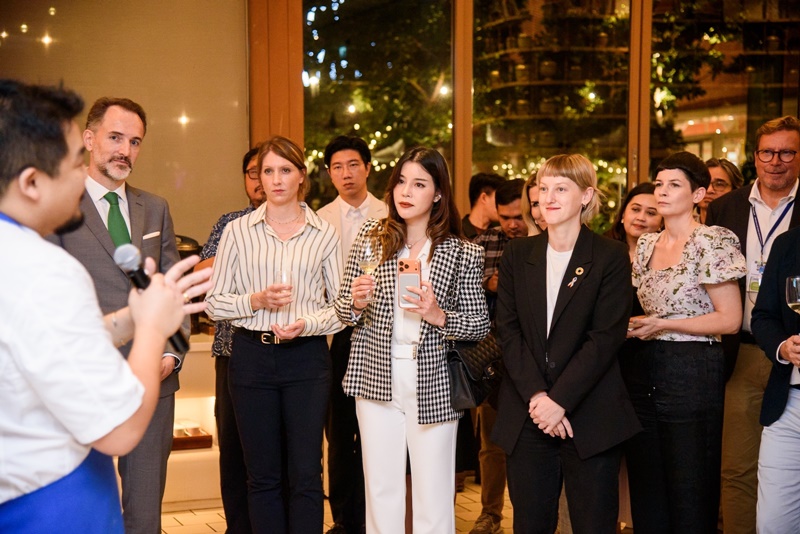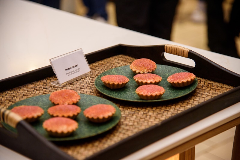 งานเลี้ยงอาหารค่ำเริ่มต้นด้วยการเสิร์ฟอาหารว่างแบบ 3 คำ โดยแต่ละคำสะท้อนเอกลักษณ์ของภูมิภาคที่แตกต่างกันของไทย พร้อมเผยให้เห็นความหลากหลายและรุ่มรวยทางอาหารในประเทศไทย