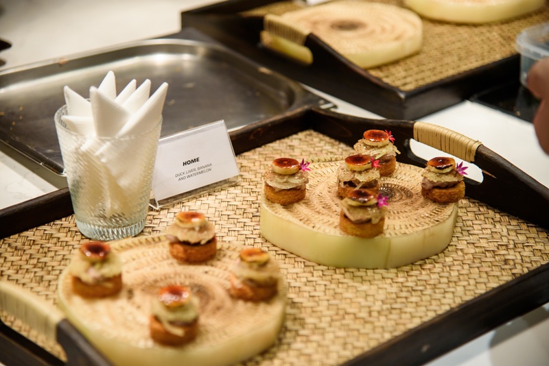 - บ้านเกิด: ตับเป็ดกล้วย และแตงโม เสิร์ฟเป็นอาหารว่างคำเดียวที่แปลกใหม่ ผสานความเข้มข้นและความสดชื่นอย่างลงตัว