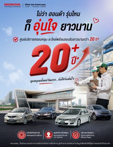 “ไม่ว่าฮอนด้ารุ่นไหน ก็อุ่นใจยาวนาน” คือคำมั่นสัญญาที่ฮอนด้ายึดถือมาโดยตลอด เพื่อสร้างความเชื่อมั่นว่า ฮอนด้าจะยังคงเป็นแบรนด์ที่อยู่เคียงข้างคนไทย พร้อมก้าวไปข้างหน้าและเติบโตอย่างยั่งยืนร่วมกับสังคมไทยในทุกยุคสมัย