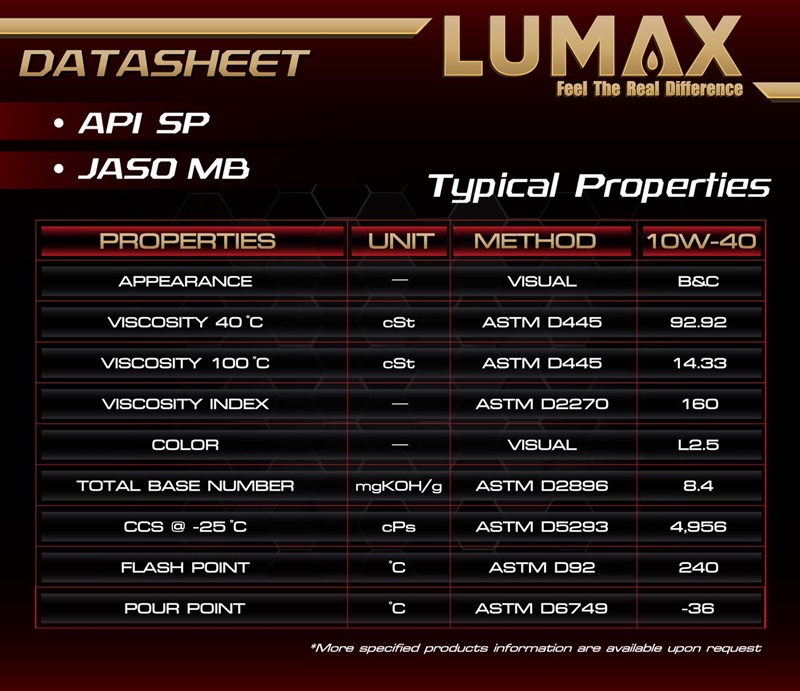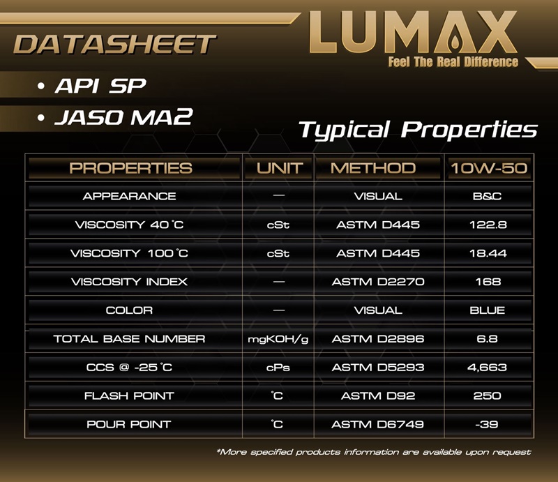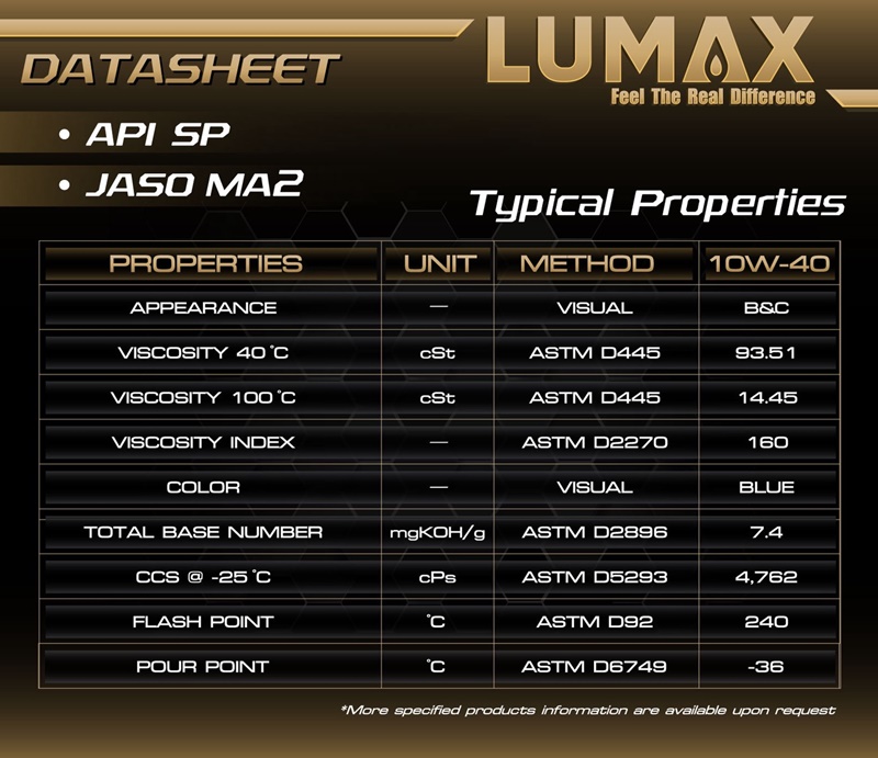 • LUMAX RS-1 10W-40 และ 10W-50 มาตรฐาน JASO MA2 สำหรับรถสปอร์ตเกียร์ธรรมดา
