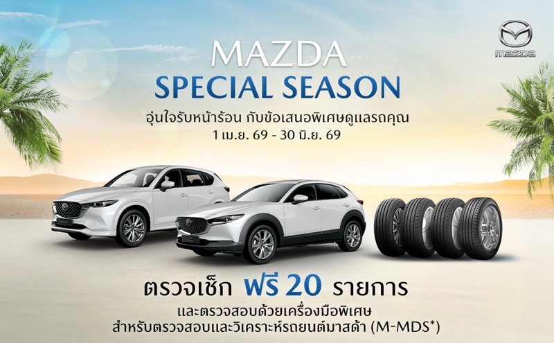 ครั้งนี้ มาสด้าจึงได้จัดแคมเปญ “MAZDA SPECIAL SEASON อุ่นใจรับหน้าร้อน กับข้อเสนอพิเศษดูแลรถคุณ” ชวนลูกค้ามาสด้า นำรถเข้ารับบริการตรวจเช็กฟรี 20 รายการ โดยตรวจสอบด้วยเครื่องมือพิเศษ สำหรับตรวจและวิเคราะห์รถยนต์มาสด้า (M-MDS*) พร้อมมอบข้อเสนอ ผ่อน 0% นานสูงสุด 6 เดือน** (เฉพาะบัตรเครดิตที่ร่วมรายการ) สำหรับลูกค้าที่ซื้อยางรถยนต์ TOYO TIRES และมอบข้อเสนอส่วนลดสูงสุด 5,000 บาท** เมื่อซื้อยางครบทุก 4 เส้น ซึ่งผู้ที่สนใจสามารถสอบถามข้อมูลเพิ่มเติมที่ศูนย์บริการมาสด้าทั่วประเทศ ตั้งแต่วันนี้ ไปจนถึงวันที่ 30 มิถุนายน 2569