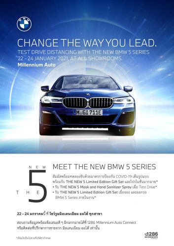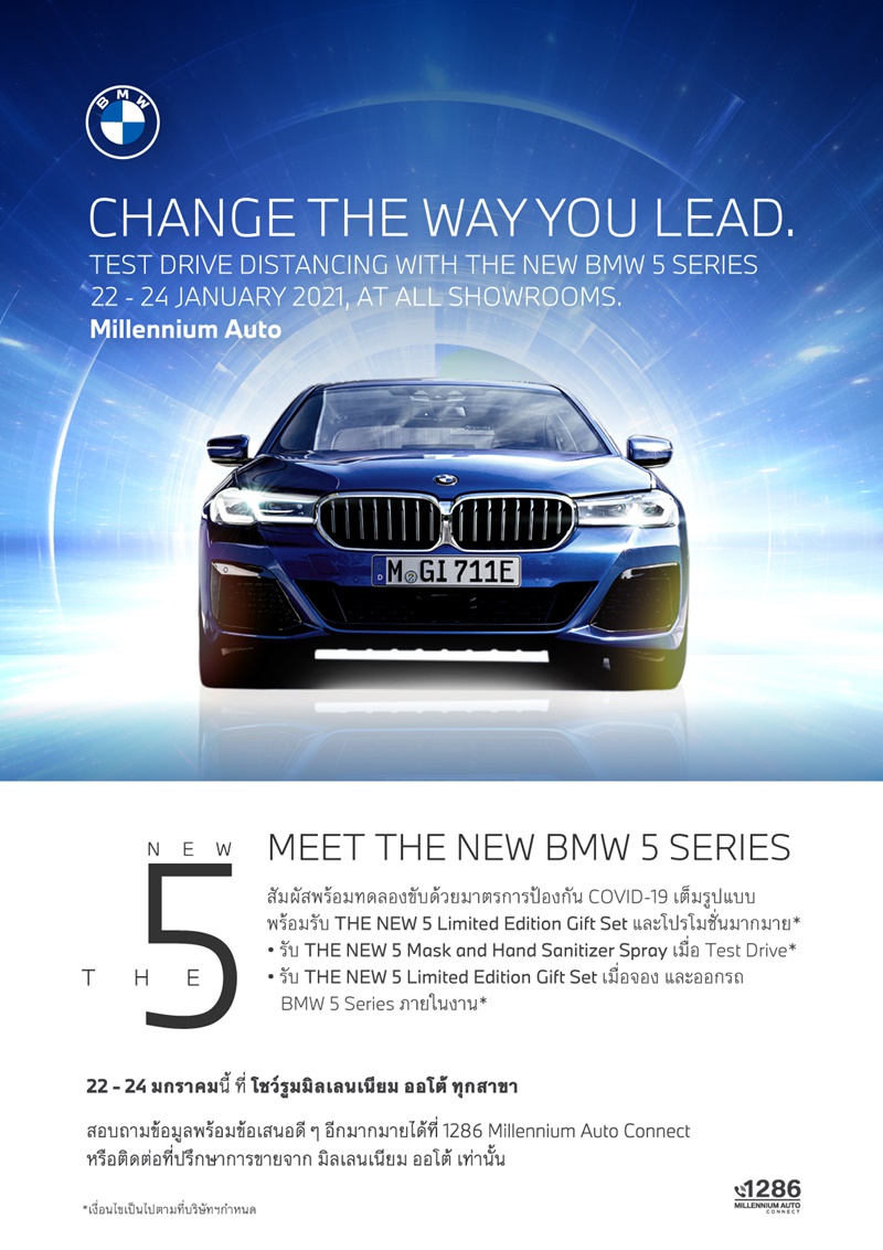 บริษัท มิลเลนเนียม ออโต้ กรุ๊ป จำกัด หนึ่งในผู้จำหน่ายรถยนต์ บีเอ็มดับเบิลยู, มินิ และมอเตอร์ไซค์ บีเอ็มดับเบิลยู มอเตอร์ราด ประเดิมศักราชใหม่ด้วยกิจกรรมพิเศษ ‘Change The Way You Lead’ นำยนตรกรรม The New BMW 5 Series ที่เพิ่งเปิดตัวอย่างเป็นทางการในประเทศไทย ให้ผู้สนใจได้ทดลองขับก่อนใคร ระหว่างวันที่ 22-24 มกราคม 2564 ที่โชว์รูมมิลเลนเนียม ออโต้ ทุกสาขา