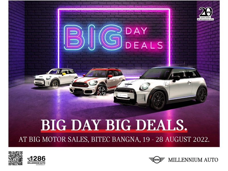 มิลเลนเนียม ออโต้ กรุ๊ป หยิบยื่นข้อเสนอสุดพิเศษ ให้กับผู้ที่กำลังสนใจยนตรกรรมในเครือ บีเอ็มดับเบิลยู ยกทัพรถยนต์ บีเอ็มดับเบิลยู, มินิ และมอเตอร์ไซค์ บีเอ็มดับเบิลยู มอเตอร์ราด หลากรุ่น มาจัดแสดงพร้อมจำหน่ายภายในงาน Big Motor Sale 2022
