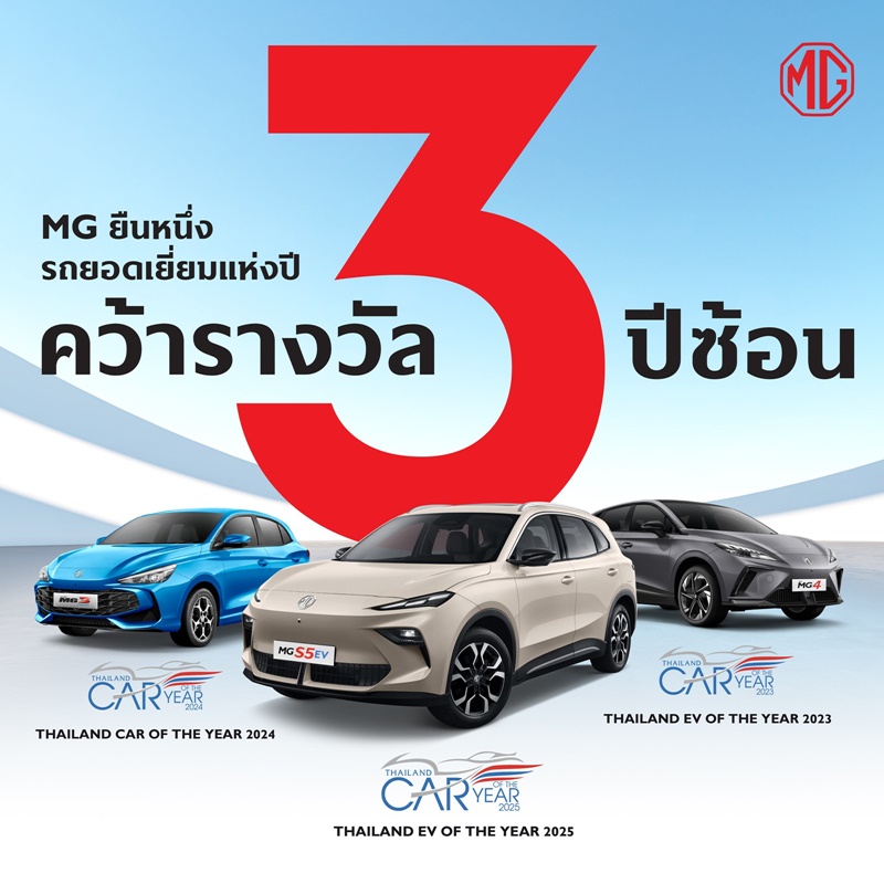 บริษัท เอสเอไอซี มอเตอร์ – ซีพี จำกัด และ บริษัท เอ็มจี เซลส์ (ประเทศไทย) จำกัด ผู้ผลิตและผู้จำหน่ายรถยนต์เอ็มจีในประเทศไทยสะท้อนความมุ่งมั่นในยกระดับอุตสาหกรรมยานยนต์ไทยให้ทัดเทียมอุตสาหกรรมยานยนต์โลก ด้วยการสร้างประวัติศาสตร์เป็นแบรนด์รถยนต์แบรนด์แรกในไทยที่ได้รับรางวัลรถยอดเยี่ยมแห่งปีบนเวทีระดับประเทศได้ต่อเนื่อง 3 ปีซ้อน โดยล่าสุด NEW MG S5 EV รถอีวีมหาชน ได้รับรางวัลอันทรงเกียรติ THAILAND EV OF THE YEAR 2025 จากสมาคมผู้สื่อข่าวรถยนต์และรถจักรยานยนต์ไทย (สรยท.) พร้อมสร้างความเชื่อมั่นด้วยการรับประกันแบตเตอรี่แรงเคลื่อนสูง ชุดมอเตอร์ขับเคลื่อน และชุดควบคุมมอเตอร์ขับเคลื่อน (EV LIFETIME WARRANTY) ตลอดอายุการใช้งาน จนสามารถคว้ารางวัลแคมเปญยอดเยี่ยมแห่งปี จากสมาคมฯ เพื่อส่งมอบความมั่นใจในการใช้รถยนต์ไฟฟ้าให้คนไทย