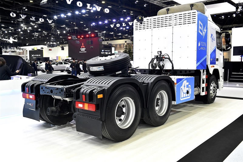 แบตเตอรี่แบบลิเธียมไอออน (Lithium-ion) ความจุแบตเตอรี่ 423 kWh กำลังมอเตอร์ไฟฟ้าสูงสุด 410 กิโลวัตต์ ให้กำลังสูงสุด 550 แรงม้า และแรงบิดสูงสุด 2,800 นิวตันเมตร พร้อมระบบเกียร์กึ่งอัตโนมัติ 6 สปีด มีหัวชาร์จแบบ DC สามารถชาร์จได้พร้อมกัน 2 หัว ระยะทางวิ่งต่อการชาร์จประมาณ 300 กิโลเมตร (ขึ้นอยู่กับพฤติกรรมการขับขี่ของผู้ขับรถ) ระบบเบรกลมแบบวงจรคู่ (Dual Circuit Air Braking System) ใช้ระบบเบรกที่เชื่อถือได้และเป็นมาตรฐานสำหรับรถบรรทุกขนาดใหญ่ เพื่อประสิทธิภาพในการหยุดรถที่ดี ระบบเบรกเสริม (Regenerative Braking) ด้วยมอเตอร์ไฟฟ้ามีระบบช่วยเบรกด้วยการเปลี่ยนพลังงานจลน์กลับไปเป็นพลังงานไฟฟ้าเก็บเข้าแบตเตอรี่ ซึ่งช่วยชะลอความเร็วรถได้อย่างมีประสิทธิภาพและยังช่วยลดการสึกหรอของเบรกหลักด้วย ระบบเบรกมือ (Parking Brake) เป็นแบบดรัมเบรกเพื่อการจอดรถที่มั่นคง ล้อขนาด 22.5 นิ้ว โดยเป็นขอบล้อที่ออกแบบมาให้ใช้กับยางขนาด 12R22.5 ซึ่งเป็นขนาดมาตรฐานสำหรับรถบรรทุกหนักในประเทศไทย