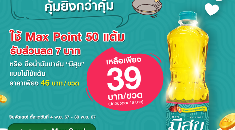 ซื้อน้ำมันปาล์ม “มีสุข” คุ้มยิ่งกว่าคุ้ม สมาชิก Max Card แลกซื้อน้ำมันปาล์ม “มีสุข” ในราคาเพียงขวดละ 39 บาท