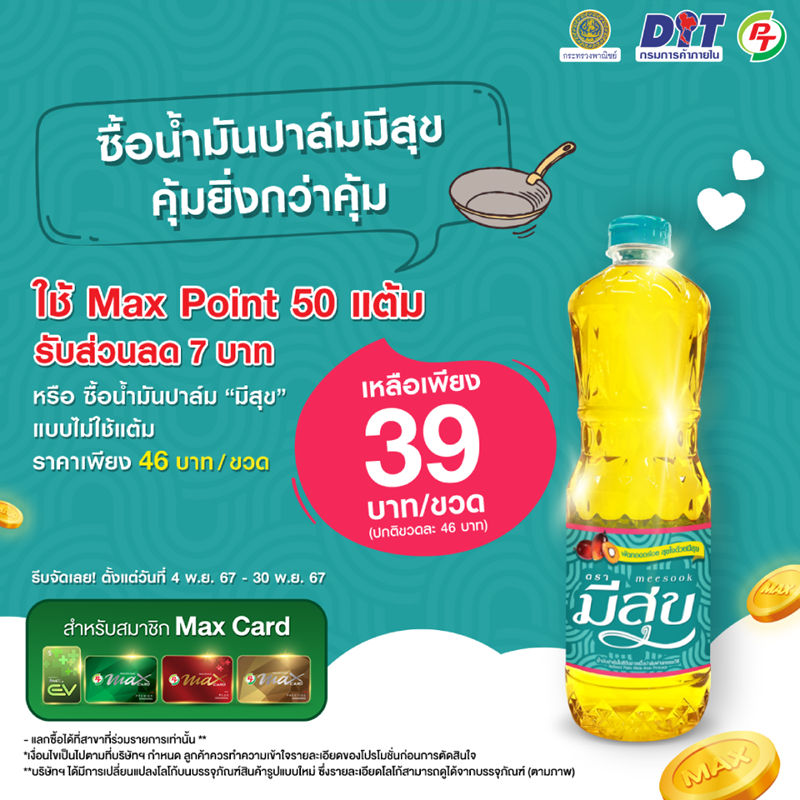 กรมการค้าภายใน กระทรวงพาณิชย์ บริษัท พีทีจี เอ็นเนอยี จำกัด (มหาชน) หรือ PTG ร่วมแบ่งเบาภาระค่าครองชีพให้กับคนไทยและลูกค้าสมาชิกผู้ถือบัตร Max Card ด้วยการจัดโปรโมชั่นตรึงราคาน้ำมันปาล์ม “มีสุข” ซื้อน้ำมันปาล์ม “มีสุข”คุ้มยิ่งกว่าคุ้ม ตั้งแต่วันที่ 4 พ.ย. 67 – 30 พ.ย. 67 เพื่อให้คนไทยได้มีความสุขไปกับทุกมื้ออาหาร และมีชีวิตที่อยู่ดีมีสุข