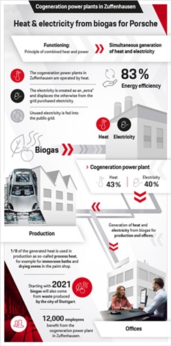 ระบบ cogeneration แบบใหม่ จะถูกนำมาใช้เพื่อผลิตความร้อนและพลังงานแทนที่เครื่องกำเนิดพลังงานเดิมใน สายการผลิต สำหรับปอร์เช่ซึ่งติดตั้งเครื่องจักรที่ใช้เชื้อเพลิงจากก๊าซธรรมชาติไว้ 2 เครื่องในปัจจุบัน ระบบใหม่นี้สามารถ ปรับใช้เชื้อเพลิงก๊าซชีวภาพ เพิ่มเติมได้ด้วยเช่นกัน สำนักงานใหญ่ของปอร์เช่ในสตุ๊ทการ์ท กำลังอยู่ในขั้นตอนการปรับใช้ พลังงานชีวภาพที่ได้จากสิ่งปฏิกูลของแหล่งชุมชนในตัวเมือง โดยความร่วมมือของคณะกรรมาธิการบริหาร City of Stuttgart commissions ทั้งนี้คาดว่าโครงการจะแล้วเสร็จในปี 2021
