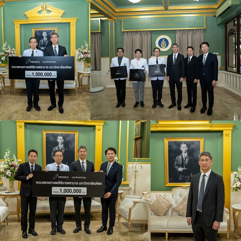 บริษัทในเครือ ไพรม์มัส กรุ๊ป นำโดย ณัฏฐวุฒิ ตั้งคารวคุณ (ที่ 3 จากขวา) ประธาน, จิระพล รุจิวิพัฒน์ (ที่ 2 จากขวา) กรรมการผู้จัดการ บริษัทในเครือ ไพรม์มัส กรุ๊ป และ ศราวุธ ไชยมังกร (ที่ 1 จากขวา) รองกรรมการผู้จัดการ บริษัท ไพรม์มัส ออโต้เฮาส์ จำกัด มอบเงินสมทบทุน จำนวน 1,000,000 บาท จากการจัดกิจกรรมการกุศลในกลุ่มลูกค้ารถยนต์ เครือไพรม์มัส กรุ๊ป ประจำปี 2568 ให้แก่ กองทุนห้องผ่าตัด โรงพยาบาลศิริราช โดยได้รับเกียรติจาก ศาสตราจารย์ นายแพทย์ ธวัชชัย อัครวิพุธ (ที่ 3 จากซ้าย) รองคณบดีและผู้อำนวยการ โรงเรียนแพทย์ศิริราช, รองศาสตราจารย์ นายแพทย์ นริศ กิจณรงค์ (ที่ 2 จากซ้าย) รองหัวหน้า ฝ่ายบริการ ภาควิชาจักษุวิทยา คณะแพทยศาสตร์ศิริราชพยาบาล มหาวิทยาลัยมหิดล และ ศาสตราจารย์ ด๊อกเตอร์ นายแพทย์ วิปร วิประกษิต (ที่ 1 จากซ้าย) แพทย์ผู้เชี่ยวชาญ สาขาโลหิตวิทยาและอองโคโลยี (มะเร็งวิทยา) ภาควิชากุมารเวชศาสตร์ คณะแพทยศาสตร์ศิริราชพยาบาล มหาวิทยาลัย มหิดล เป็นผู้รับมอบ ณ ห้องรับรองงานองค์กรสัมพันธ์และกิจการพิเศษ ตึกอำนวยการ ชั้น 1 โรงพยาบาลศิริราช