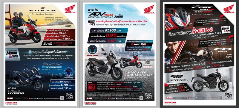 ออกรถฮอนด้าบิ๊กไบค์ ผ่อนเริ่มต้นเพียง 2,937 บาทต่อเดือน รับ Gift Voucher มูลค่า 10,000 – 50,000 บาท และรับฟรี ประกันภัยชั้นหนึ่ง ทะเบียน พรบ สุดแห่งข้อเสนอตรงใจ และดีที่สุดแห่งปี ในงาน Motor Expo 2019