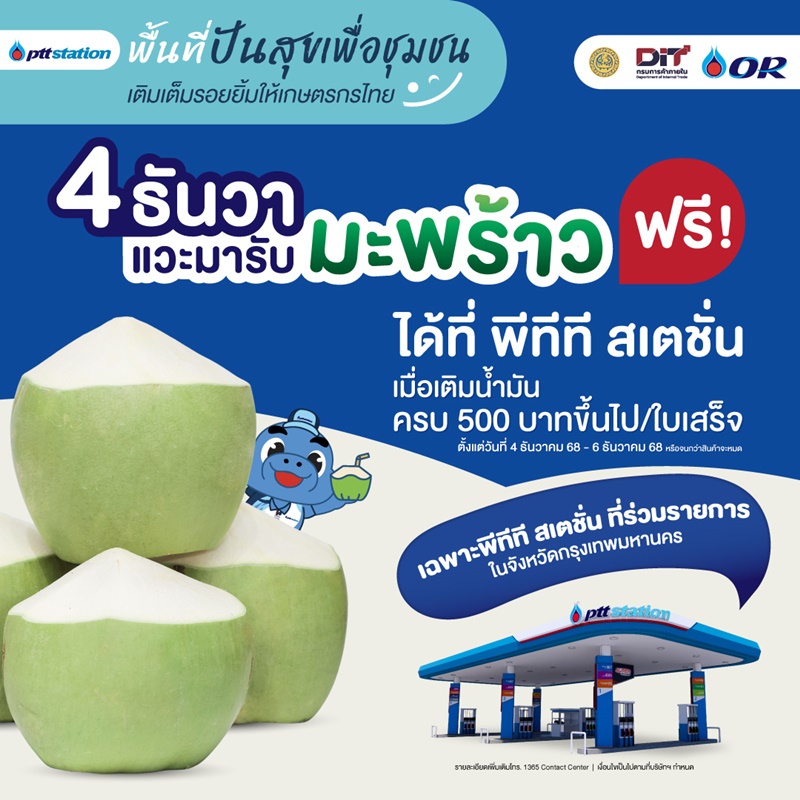 นายวิทยากร มณีเนตร อธิบดีกรมการค้าภายใน พร้อมด้วย นายพิมาน พูลศรี รองประธานเจ้าหน้าที่บริหารด้านธุรกิจค้าปลีกน้ำมัน บริษัท ปตท. น้ำมันและการค้าปลีก จำกัด (มหาชน) (OR) ร่วมเปิดกิจกรรม “เติมเต็มรอยยิ้มให้เกษตรกรไทย เติมน้ำมันรับฟรี มะพร้าว” ณ พีทีที สเตชั่น ในพื้นที่กรุงเทพฯ รวม 188 สถานี เพื่อช่วยเหลือเกษตรกรไทยในช่วงที่ผลผลิตล้นตลาด พร้อมส่งต่อผลไม้คุณภาพจากแหล่งผลิตโดยตรงสู่มือผู้บริโภค โดย พีทีที สเตชั่น ได้รับซื้อมะพร้าวจากเกษตรกรผู้ปลูกมะพร้าว เพื่อส่งมอบเป็นของขวัญแทนคำขอบคุณให้กับลูกค้าที่เติมน้ำมันครบ 500 บาทขึ้นไปต่อใบเสร็จ รับฟรีมะพร้าว 1 ลูก (จำกัด 1 ลูก/ใบเสร็จ) โดยรวมแล้วมีการจัดสรรผลผลิตกว่า 20,000 ลูก เพื่อกระจายให้กับลูกค้าในสถานีบริการที่ร่วมรายการ ระหว่างวันที่ 4 – 6 ธันวาคม 2568 หรือจนกว่าสินค้าจะหมด