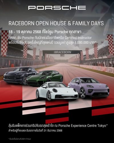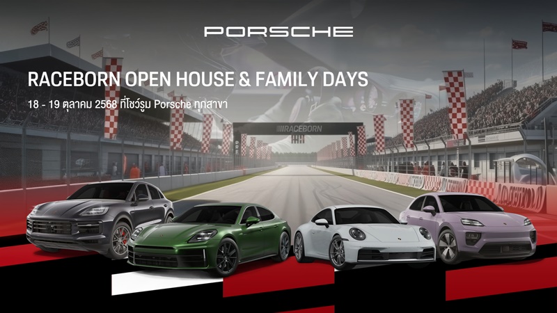 เตรียมพบกับงาน Raceborn Open House & Family Days ซึ่งจัดขึ้นโดยปอร์เช่ ประเทศไทย ระหว่างวันที่ 18 – 19 ตุลาคม 2568 ณ โชว์รูมปอร์เช่อย่างเป็นทางการพร้อมกันทุกแห่ง เตรียมมอบประสบการณ์สุดพิเศษให้แก่ผู้ชื่นชอบและผู้ที่สนใจในยนตรกรรมปอร์เช่ ภายในงานจะได้พบกับ การจัดแสดงยนตรกรรมสปอร์ตหลากหลายรุ่นในลวดลายรถแข่งในตำนาน และสำหรับผู้ที่เข้าร่วมการทดลองขับภายในงานจะได้ทดลองขับร่วมกับนักแข่งมืออาชีพและผู้เชี่ยวชาญด้านการขับขี่ที่ได้รับการรับรองจากปอร์เช่ นอกจากนี้ผู้ที่จองและรับรถในช่วงเวลาที่กำหนดจะได้ลุ้นรับแพ็คเกจร่วมขับรถสุดเอ็กซ์คลูซีฟ ณ Porsche Experience Centre กรุงโตเกียว ประเทศญี่ปุ่น* และรับข้อเสนอพิเศษแห่งปีสำหรับรุ่นมาคันน์, ไทคานน์, คาเยนน์ และพานาเมรา รวมมูลค่าสูงสุดกว่า 1 ล้านบาท สำหรับผู้ที่จองและรับมอบรถยนต์ภายใน 31 ตุลาคม 2568 เท่านั้น*