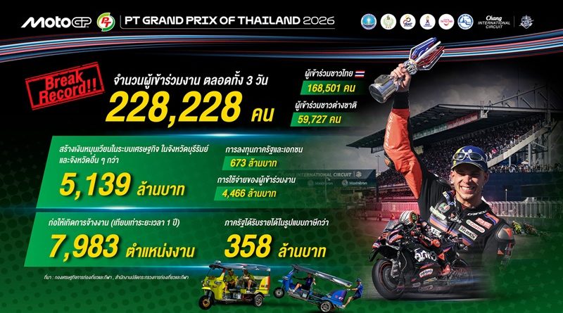 จบไปแล้วกับอีเว้นต์กีฬาสุดยิ่งใหญ่แห่งปี ศึกรถจักรยานยนต์ชิงแชมป์โลก “โมโตจีพี” รายการ “พีที กรังด์ปรีซ์ ออฟ ไทยแลนด์ 2026” (PT Grand Prix of Thailand 2026) โดยประเทศไทยเป็นเจ้าภาพ การทดสอบก่อนเปิดฤดูกาล หรือ Pre-Season Test วันที่ 21-22 ก.พ. และ สนามที่ 1 เปิดฤดูกาล ระหว่าง วันที่ 27 ก.พ. – 1 มี.ค. 2569 ที่ สนามช้าง อินเตอร์เนชั่นแนล เซอร์กิต จ.บุรีรัมย์ รัฐบาลไทย นำโดยการกีฬาแห่งประเทศไทย กระทรวงการท่องเที่ยวและกีฬาเป็นแม่งาน ผนึกกำลังกับหน่วยงานภาครัฐ-ภาคเอกชนและภาคประชาชน