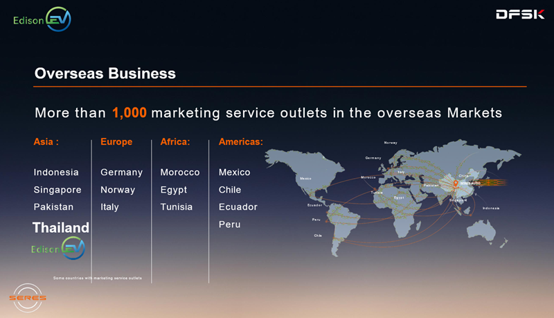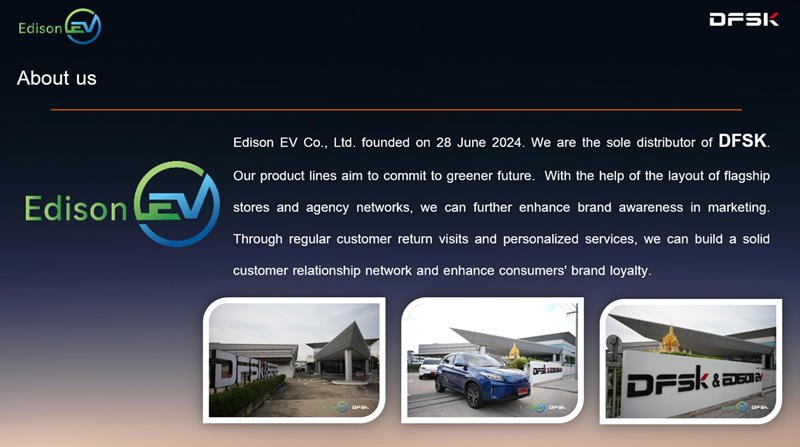 นางสาวธันย์จิรา ภูริชพุฒิพันธ์ ผู้จัดการทั่วไป บริษัท เอดิสัน อีวี จำกัด กล่าวว่า “Edison EV ก่อตั้งเมื่อ 28 มิถุนายน 2567 โดยได้รับการแต่งตั้งเป็นผู้จัดจำหน่ายแต่เพียงผู้เดียวของรถยนตไฟฟ้าแบรนด์ DFSK ในไทย ภายใต้การสนับสนุนจาก SERES Group ผู้ผลิตรถยนต์ไฟฟ้าชั้นนำของจีน ผ่าน DFSK (Chongqing Sokon Motor (Group) Import & Export Co., Ltd.) ”