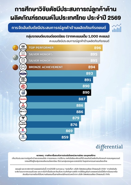 นายศิรส สาตราภัย กรรมการผู้จัดการบริษัท ดิฟเฟอเรนเชียล ประจำประเทศไทย เปิดเผยว่า “ผลการศึกษาวิจัย “ประสบการณ์ลูกค้าด้านผลิตภัณฑ์รถยนต์ในประเทศไทย” หรือ “Product Customer Experience Index (Product CXI) Study℠” ในครั้งนี้เราพบว่า เจ้าของรถในกลุ่ม GWM มีความพึงพอใจเฉลี่ยสูงสุด และครองอันดับหนึ่งด้วยคะแนน 896 คะแนนจากคะแนนเต็ม 1,000 คะแนน รองลงมาคือ Honda และ Mazda (ได้ 895 คะแนนเท่ากัน) Nissan (ได้ 894 คะแนน) Ford (ได้ 893 คะแนน) และ Toyota (ได้ 891 คะแนน) โดยทุกยี่ห้อที่กล่าวมา มีคะแนนสูงกว่าค่าเฉลี่ยของอุตสาหกรรมซึ่งอยู่ที่ 890 คะแนน ขณะที่ MG ได้ 890 คะแนนซึ่งอยู่ที่ระดับค่าเฉลี่ย ส่วนแบรนด์อื่น ๆ ได้คะแนนต่ำกว่าค่าเฉลี่ยของอุตสาหกรรม”