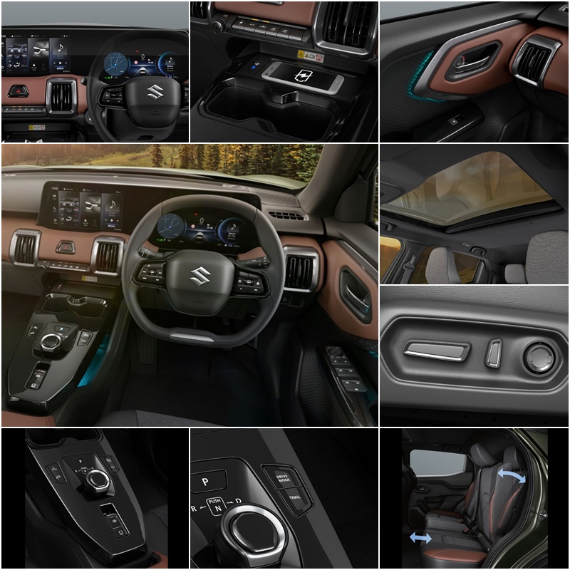 การออกแบบภายในห้องโดยสาร ALL NEW SUZUKI e VITARA ได้รับการออกแบบอย่างพิถีพิถันให้มีความกลมกลืนสอดคล้องกับรูปแบบภายนอกผสานความเป็นรถยนต์ไฟฟ้าและสมรรถนะการขับขี่ในแบบฉบับของรถ SUV ได้อย่างลงตัว โดยเน้นด้านเทคโนโลยีที่ทันสมัย อาทิ หน้าจอแสดงผลแบบ Integrated Display System ที่ออกแบบให้เชื่อมต่อทุกข้อมูลการขับขี่และฟังก์ชันการใช้งานไว้อย่างครบครันในหน้าจอเดียว ช่วยให้ผู้ขับขี่สามารถเข้าถึงข้อมูลได้อย่างสะดวกและรวดเร็ว โดยแบ่งการแสดงผลออกเป็นหน้าจอมาตรวัดขนาด 10.25 นิ้ว ที่รองรับการปรับรูปแบบการแสดงผลได้ถึง 3 รูปแบบ เพื่อให้เหมาะสมกับความต้องการของผู้ขับขี่ และหน้าจอระบบสัมผัสบริเวณคอนโซลกลางขนาด 10.1 นิ้ว รองรับการเชื่อมต่อสมาร์ตโฟนผ่าน Apple CarPlay และ Android Auto มาพร้อมระบบเครื่องเสียงคุณภาพสูงจาก Infinity ที่ติดตั้งลำโพงถึง 8 ตำแหน่ง พร้อมซับวูฟเฟอร์และแอมพลิไฟเออร์โดยทำงานร่วมกับ Digital Signal Processor เพื่อปรับแต่งคุณภาพเสียงให้มีความสมดุล คมชัด และสมจริงในทุกมิติ ช่วยยกระดับประสบการณ์ความบันเทิงตลอดการเดินทาง อีกทั้งไฟสร้างบรรยากาศภายในห้องโดยสาร ปรับเปลี่ยนได้ 12 เฉดสี ปรับระดับความสว่างได้ 7 ระดับ และแผงประตูดีไซน์เฉพาะตัว ที่ยังคงความเป็น SUV 4WD คอนโซลหน้าทรงสูงให้ความรู้สึกมั่นคง ระบบปรับอากาศแบบอัตโนมัติพร้อมแผ่นกรองอากาศ PM 2.5 และแท่นชาร์จไร้สาย พวงมาลัยดีไซน์ในรูปทรงสี่เหลี่ยมโค้งมนด้านล่าง ช่วยเพิ่มความสะดวกในการขึ้น-ลงรถ พร้อมติดตั้งปุ่มควบคุมฟังก์ชันต่างๆ อย่างครบครันในตำแหน่งที่ใช้งานง่าย ช่วยให้ผู้ขับขี่สามารถควบคุมระบบต่างๆ ได้อย่างมั่นใจและปลอดภัย รวมถึงเบาะนั่งที่ถูกออกแบบเพื่อรองรับความสะดวกสบายในการขับขี่ เบาะนั่งด้านคนขับปรับไฟฟ้า 10 ทิศทาง พร้อมด้วยระบบปรับความอุ่นของเบาะนั่งคู่หน้า เบาะผู้โดยสารตอนหลังปรับพับได้แบบ 4:2:4 และสามารถสไลด์เลื่อนหน้า-หลังได้ เพื่อรองรับความสะดวกสบายในการขับขี่ในทุกเส้นทาง