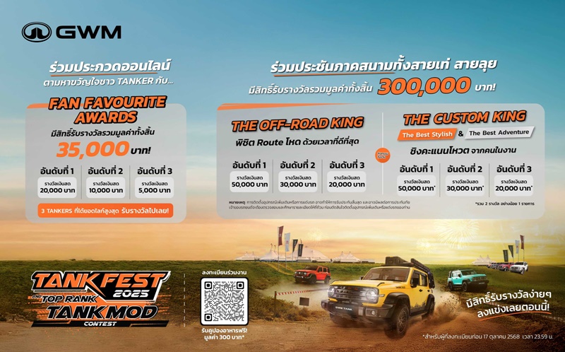 GWM (Thailand) ยกระดับสู่การเป็นแบรนด์รถยนต์ที่มีผลิตภัณฑ์ครอบคลุมทุกประเภทพลังงานที่ตอบสนองความต้องการของผู้ใช้งานทั่วทุกมุมโลก ด้วยแนวคิด “ครอบคลุมทุกการใช้งาน (All Scenarios) ด้วยผลิตภัณฑ์ที่ครอบคลุมทุกพลังงาน (All Powertrains) สู่การตอบสนองทุกกลุ่มผู้ใช้งานอย่างแท้จริง (All Users)” จากความสำเร็จของตระกูลรถออฟโรดทั้ง GWM TANK 300 และ GWM TANK 500 ที่ได้รับการตอบรับอย่างล้นหลามตั้งแต่เปิดตัว สู่จำนวน TANKER หรือผู้ใช้จริงที่เติบโตอย่างก้าวกระโดด เพื่อเป็นการขอบคุณลูกค้าชาวไทยทั่วประเทศและเนื่องในโอกาสเฉลิมฉลองการส่งมอบ NEW GWM TANK 300 DIESEL ครบ 5,000 คัน ปลุกกระแสคนรักรถ GWM TANK และการตกแต่ง รวมถึงเอาใจสายซิ่ง สายลุย และสายโหด GWM จึงจัดมหกรรมเฟสติวัลสุดยิ่งใหญ่ “TANK FEST 2025 and TOP RANK TANK MOD” ครั้งแรกในไทย เนรมิตพื้นที่ขนาดมหึมาเกือบ 50,000 ตารางเมตร ให้เป็นลานกิจกรรมสุดเร้าใจ เปิดพื้นที่สำหรับแฟนพันธุ์แท้ GWM TANK ทั้งสายออฟโรดและสายชิลล์ผู้ที่ชื่นชอบการแต่งรถให้เป็นพื้นที่ได้ปล่อยของ ปลดปล่อยจินตนาการ และความคิดสร้างสรรค์ได้อย่างไร้ขีดจำกัด ผ่านกิจกรรมความสนุกที่อัดแน่นในทุกตารางนิ้ว ทั้งเวทีประกวดและจัดแสดงรถแต่ง การแข่งขันการขับขี่ออฟโรดสุดครีเอทีฟ สนามเทสต์สมรรถนะ GWM TANK กิจกรรมความสนุกอีกมากมาย พร้อมรับของที่ระลึกติดไม้ติดมือกลับบ้าน การันตีความอร่อยตลอดวันด้วยสตรีทฟู้ดกับ Food truck เจ้าดังจำนวนมาก รับชมการแสดงดนตรีคลอเคล้าบรรยากาศจากวงดนตรีชื่อดังตั้งแต่เช้าจรดเย็น พร้อมตบท้ายด้วยคอนเสิร์ตจากศิลปินชื่อดังยามค่ำคืน สำหรับผู้ที่สนใจทุกคนเข้าร่วมงานฟรีแบบไม่มีค่าใช้จ่าย จะมาคนเดียว มาเป็นคู่ เป็นแก๊งค์ หรือยกขบวนทั้งครอบครัว ปักหมุดแล้วมาเจอกัน วันเสาร์ที่ 18 ตุลาคม 2568 ณ ESC Park รังสิต จ.ปทุมธานี และวันอาทิตย์ที่ 19 ตุลาคม 2568 สำหรับผู้ที่สนใจทดลองขับ GWM