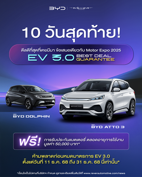 - กระแสตอบรับโปรแรงแห่งปีจาก เรเว่แรงเหลือล้น จนรถยนต์หมดสต็อกแล้วหลายรุ่นรวมถึง BYD ATTO 3 Premium, BYD SEAL Premium & AWD Performance และ DENZA D9 Premium