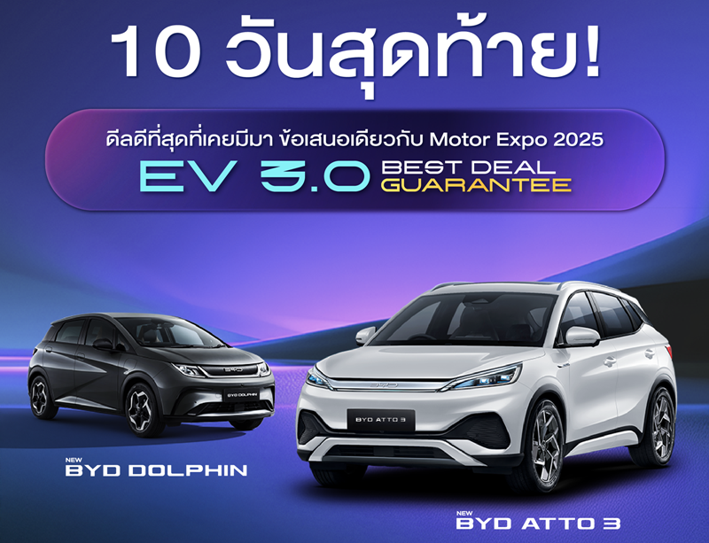 - BYD ATTO 3 ราคาพิเศษ 699,900 บาท1ในรุ่น Extended พร้อมฟรี! แพ็คเกจการรับประกันแบตเตอรี่ตลอดอายุการใช้งาน มูลค่า 50,000 บาท